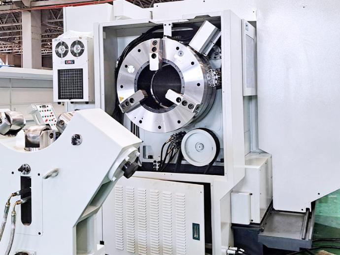 Das Ölrohr wird von der Rückseite zugeführt und das verlängerte Rohr wird durch eine hintere hydraulische Lünette gestützt, was eine stabile Bearbeitung langer und schwerer Werkstücke ermöglicht.