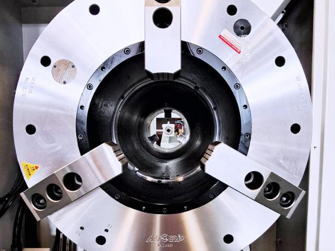 Das System verwendet eine Doppelspannfutterkonfiguration, bei der das vordere und hintere Spannfutter nacheinander arbeiten,