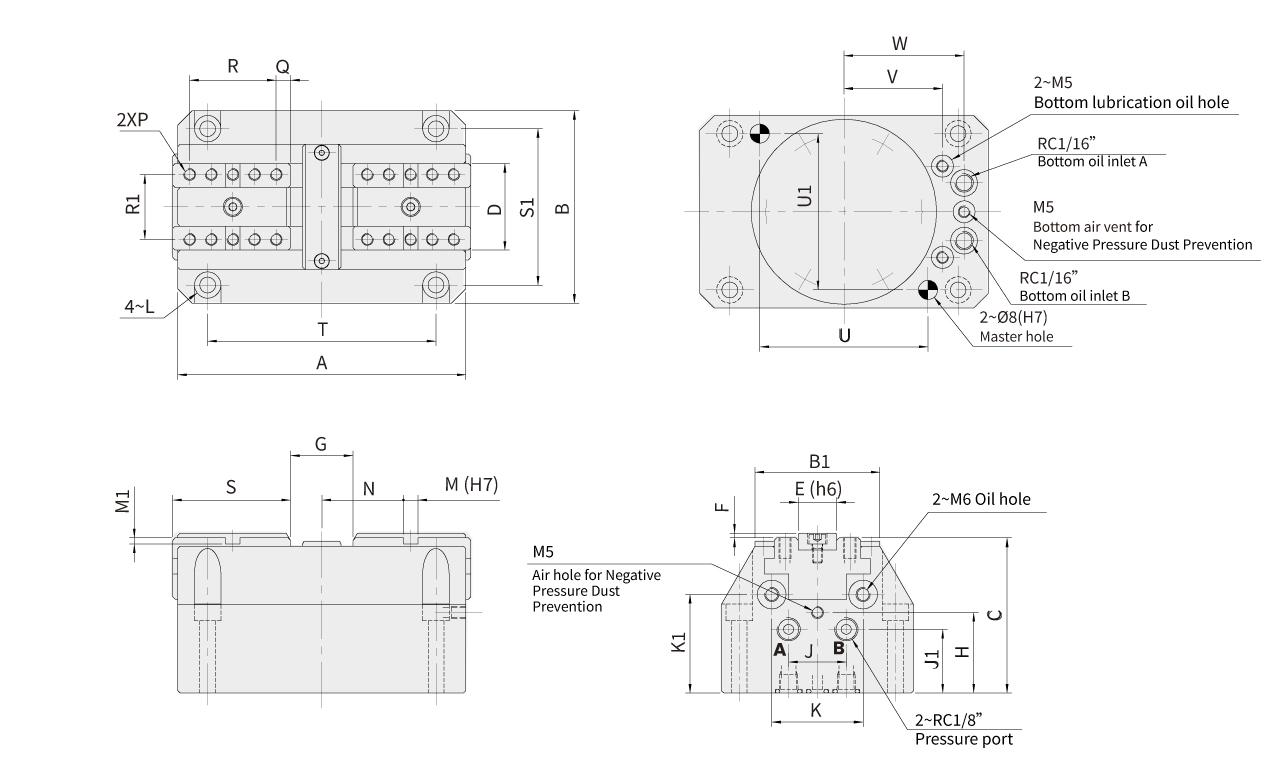 A | B | B1 | C | D | E(h6) | F | G max. | G min. | H | J | J1 | K | K1 | L | M(H7) | M1 | N max. | N min. | P | Q | R | R1 | S | T | T1 | U | U1 | V | W |