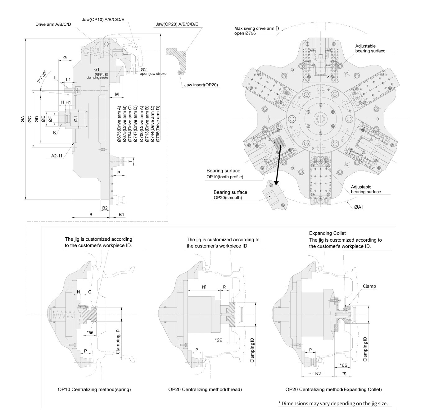 | Model | Total axial stroke (mm) | Open jaw stroke (mm) | Clamping stroke (mm) | Max. clamping size of the wheel (inch) | Min. clamping size of the wheel (inch) | Max. D.B. pull kN (kgf) | Max. clamping force kN (kgf) | Max. speed min-1(r.p.m.) | I kg‧m2 | Weight (kg) (Jig not included) | Weight (kg) (OP10 jig included) | Weight (kg) (OP20 jig included) | Matching cyl. | Max. pressure MPa (kgf/cm2) |