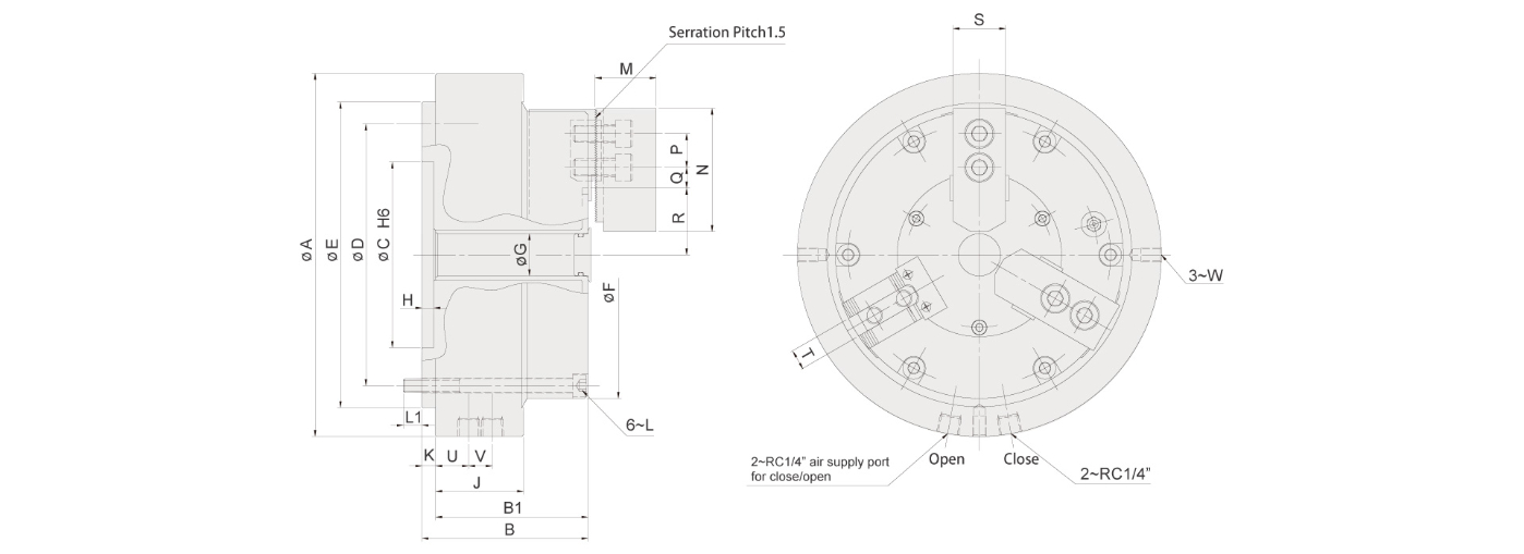 | Model | Jaw stroke (Dia.)(mm) | Chucking Dia. Max.(mm) | Chucking Dia. Min.(mm) | Max. clamping force (Pneumatic at 6.0kgf/cm2) kN (kgf) | Max. pressure (kgf/cm2) | Max. speed (r.p.m.) | Max Rotation Reslstance Torque (Nm) | Air Consumption (at 6.0 kgf/cm2) lit (kgf/cm2) | Weight (kg) |
