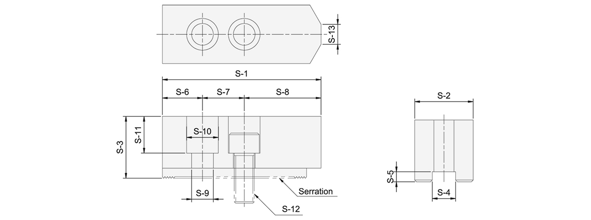 | Model | S-1 | S-2 | S-3 | S-4 | S-5 | S-6 | S-7 | S-8 | S-9 | S-10 | S-11 | S-12 | S-13 | Serration Pitch | Matching Chuck | 3 Jaw Weight (kg) |