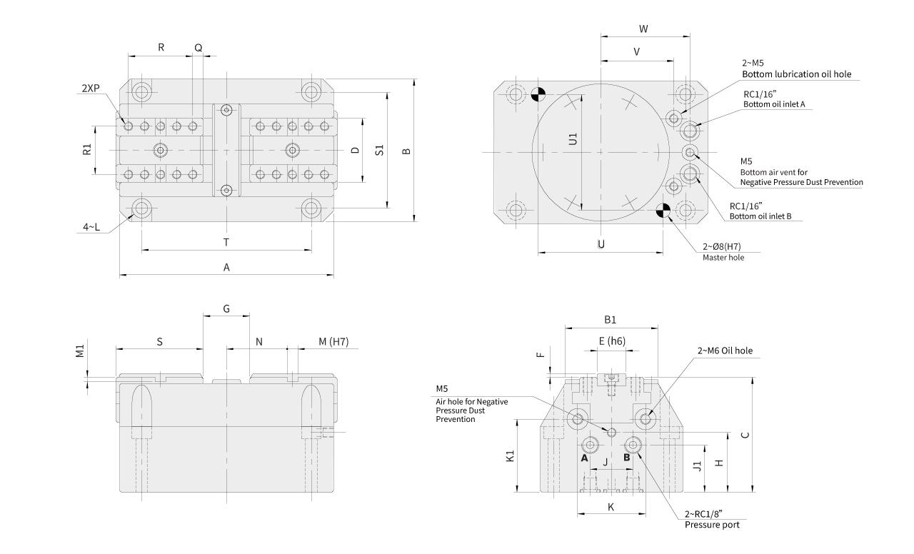 A | B | B1 | C | D | E(h6) | F | G max. | G min. | H | J | J1 | K | K1 | L | M(H7) | M1 | N max. | N min. | P | Q | R | S | S1 | T | T1 | U | U1 | V | W |